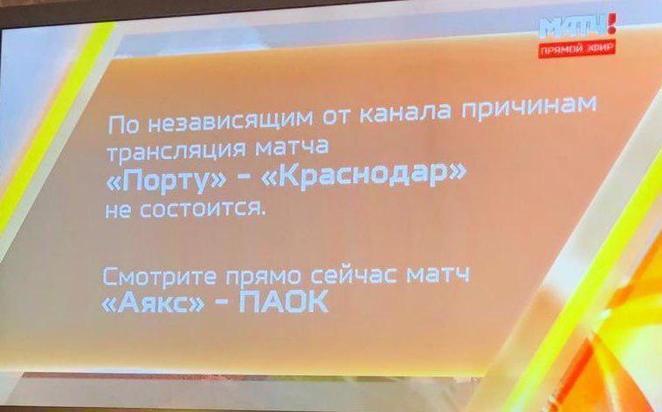 Болельщики, приготовившиеся смотреть решающий матч квалификации Лиги чемпионов, неожиданно увидели на экране заставку с сообщением, что трансляция не состоится "по независящим от канала причинам" и предложением посмотреть вместо матча российского клуба трансляцию игры "Аякс" – ПАОК.