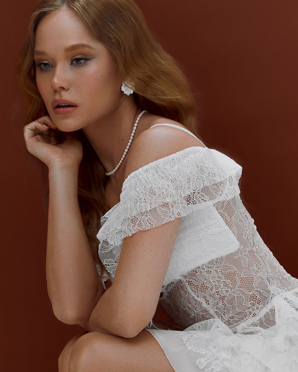 Образ Мельниковой действительно выглядит очень изысканно и стильно. Белое кружевное платье с корсетным лифом подчеркивает её фигуру, а тонкие бретели и спущенные рукава придают наряду особую женственность и легкость. Пышная юбка добавляет объема и романтичности, а туфли-лодочки и жемчужное ожерелье завершают этот элегантный look. Натуральный макияж подчеркивает её естественную красоту, создавая гармоничный и утонченный образ.