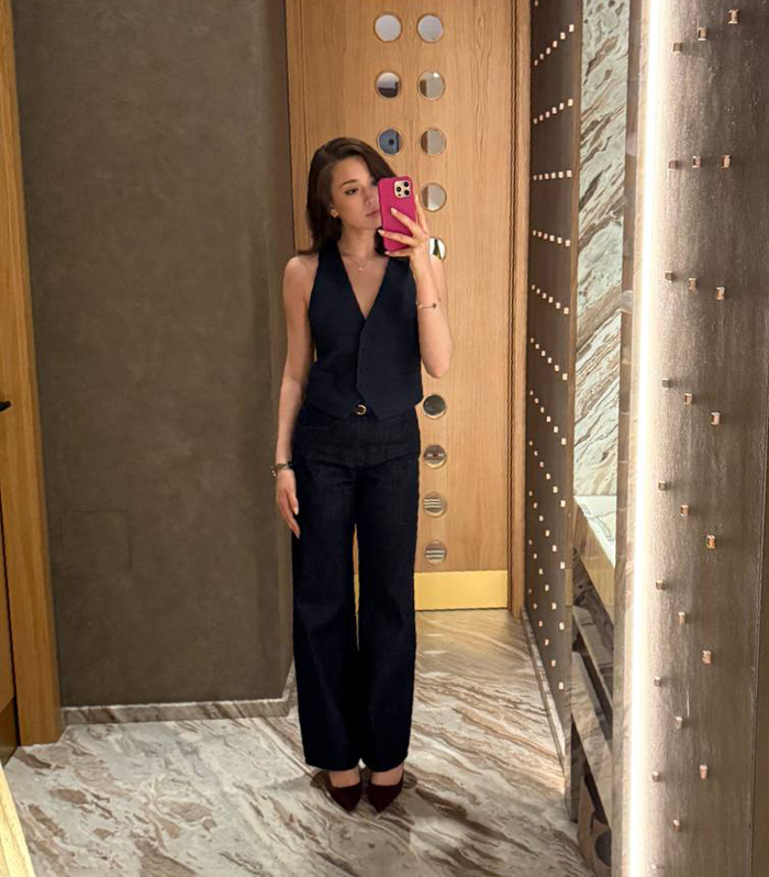 19-летняя спортсменка всё чаще предпочитает классический стиль в одежде. На этот раз для фотосессии Камила выбрала элегантный белый костюм, состоящий из классических прямых брюк и свободного жакета, под которым виднеется светлая блуза, завершив образ изящной парой туфель-лодочек в тон основному ансамблю. Нельзя не отметить, что наряд сидит на фигуристке безукоризненно, создавая атмосферу лёгкости и открытости.