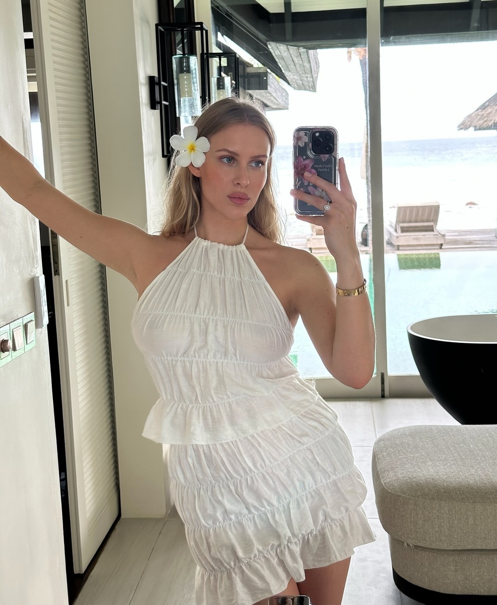 Предложение Елизавете Матвей сделал 22 февраля прошлого года, украсив комнату лепестками роз и белыми шарами, подарил букет белых тюльпанов и помолвочное кольцо из белого золота с бриллиантами.