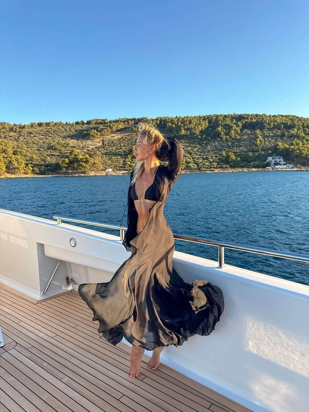 Хотя Анжелика редко делится профессиональными новостями, её поклонники всегда с нетерпением ждут новых снимков. На этот раз Тиманина покорила всех фотографиями на белоснежной яхте, облачённая в элегантный чёрный купальник. Лёгкая полупрозрачная накидка, колышущаяся на ветру, подчеркнула её изящный силуэт и безупречные линии фигуры.