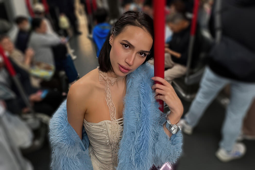 На снимках, сделанных в полутемном паркинге, Загитова предстала в изысканном и дерзком луке. На ней — короткая меховая жилетка цвета шампанского, едва прикрывающая плечи, поверх чёрного топа и кружевного бюстгальтера. Низ — мини-юбка из светлого денима с низкой посадкой, дополненная ярко-красным ремнём с крупной фурнитурой, подчеркивающим талию и добавляющим образу рок-н-рольного шарма.