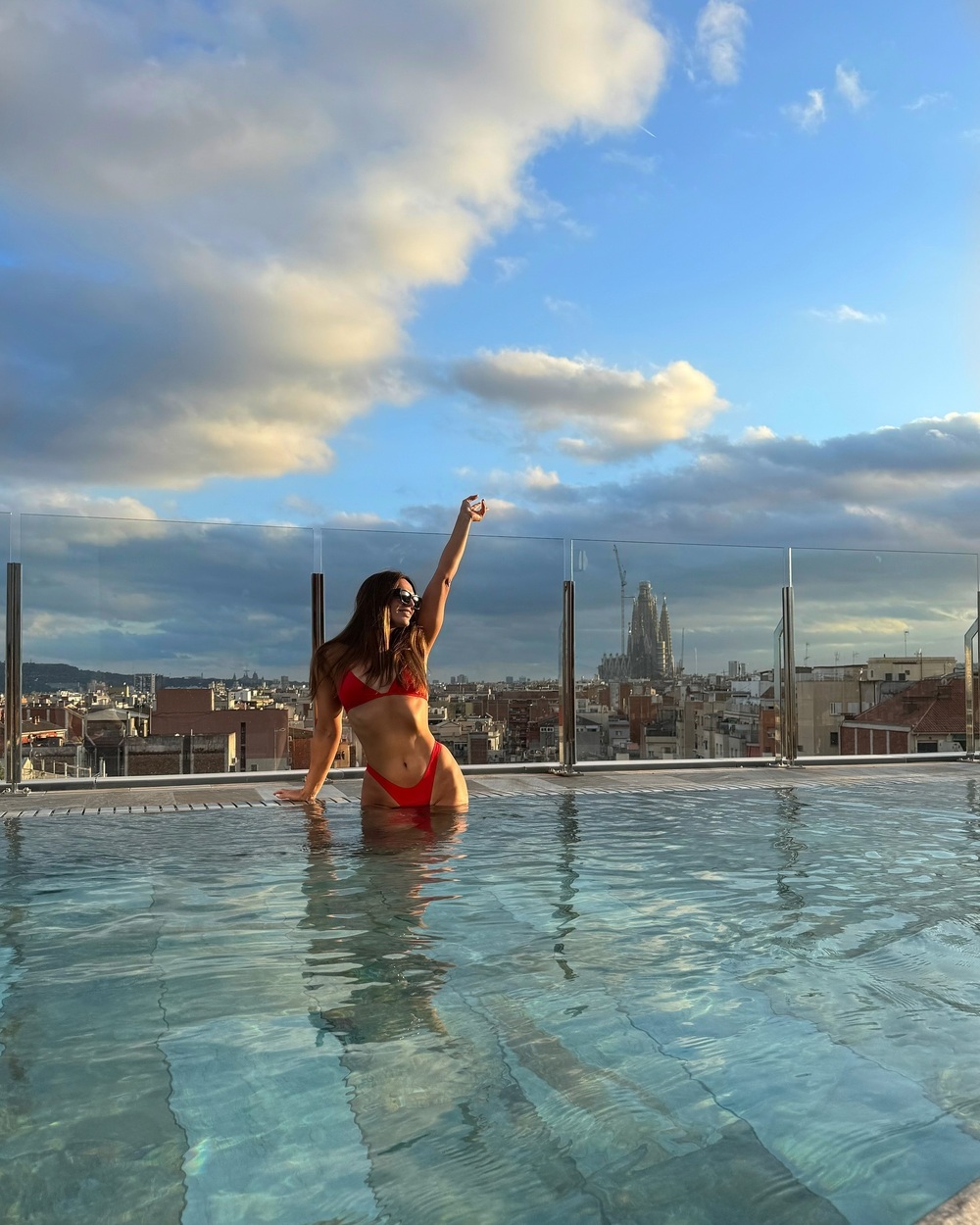 Несмотря на изнурительные тренировки, поглощающие её время и энергию, семикратная чемпионка Европы не забывает радовать своих преданных поклонников свежим контентом. На этот раз она поделилась фотографиями, на которых грациозно позирует в ярком тропическом купальнике, украшенном нежными розовыми цветами и сочными зелёными листьями, на фоне сверкающего бассейна.