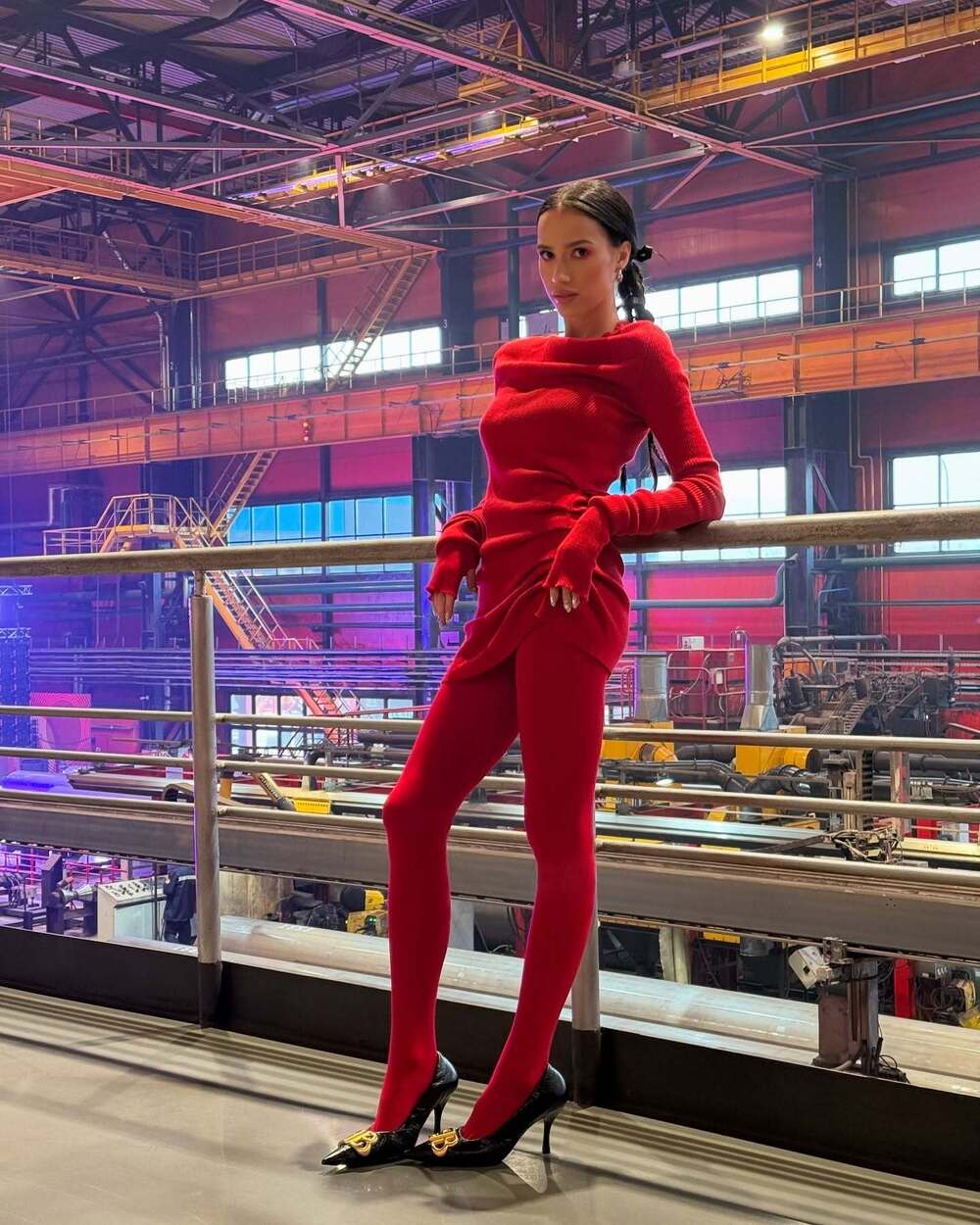 На снимках Алина предстала в смелом образе: в укороченном безрукавном жилете и коротких шортах, прозрачных чулках телесного цвета и ярко-красных лодочках. Завершил лук объемный меховой воротник насыщенного коричневого оттенка, мягко обрамляющий шею.