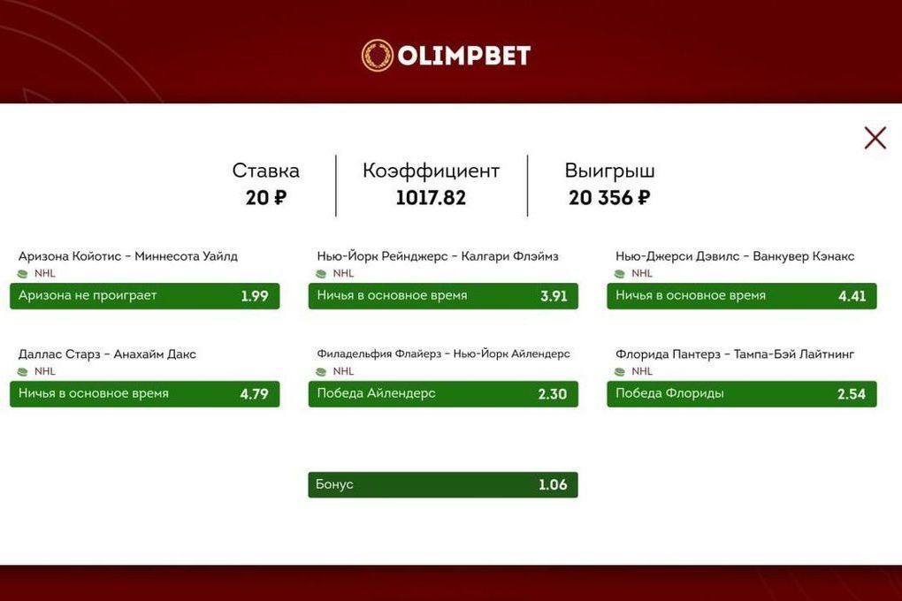 В трех остальных играх экспресса клиент Olimpbet зарядил на ничьи в основное время. Удивительно, но все срослось! Миром разошлись «Даллас» и «Анахайм», «Рейнджерс» и «Калгари», а также «Нью-Джерси» и «Ванкувер».
