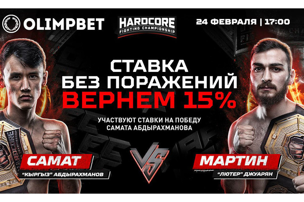 Olimpbet запустил акцию к этому поединку. Делайте ставки на победу Самата Абдырахманова у генерального партнера Hardcore, а если «Кыргыз» проиграет, то букмекер вернет 15% от суммы.