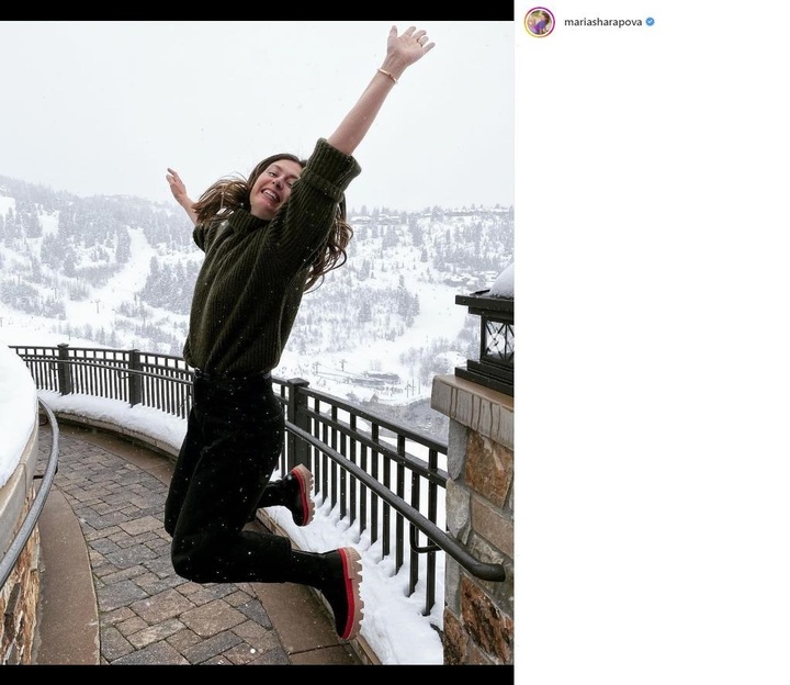 Шарапова сфотографировалась на фоне снежных гор. Звезда тенниса, одетая в теплые брюки, объемный свитер и резиновые сапожки, подпрыгнула и подняла руки вверх, при этом лицо Марии озаряет счастливая улыбка.