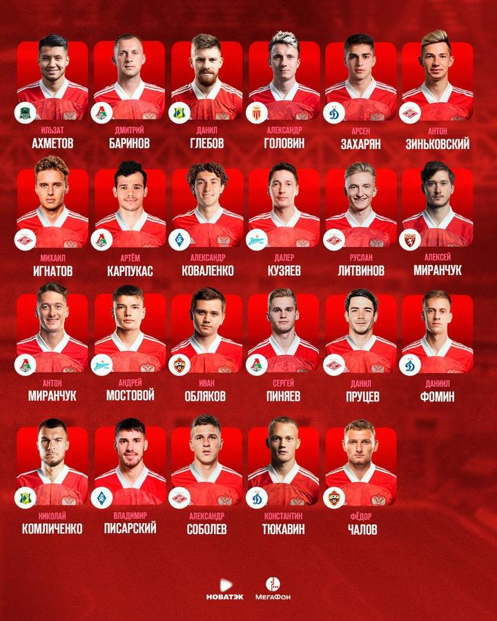 В списке нет форварда "Локомотива" Артема Дзюбы, который в минувшее воскресенье сделал хет-трик в матче против возглавляемого Карпиным "Ростова". Зато впервые с февраля 2022 года в команду вызваны легионеры - Алексей Миранчук и Александр Головин: