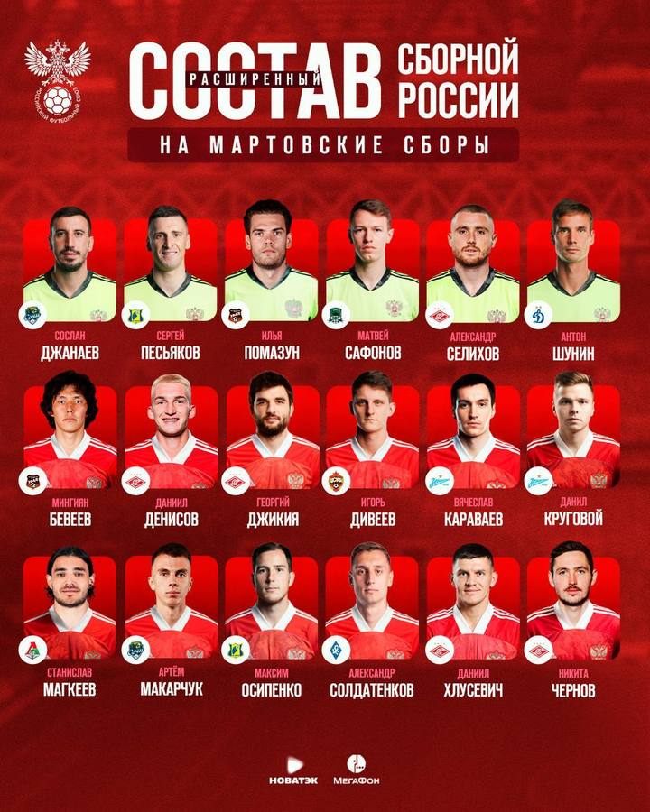 Тренерский штаб сборной России во главе с Валерием Карпиным назвал расширенный состав сборной перед мартовским учебно-тренировочным сбором.