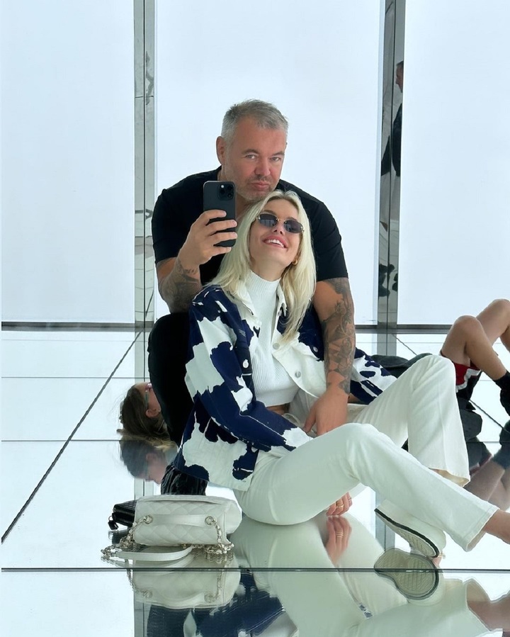 Фото сделано на смотровой площадке нью-йоркского небоскреба One Vanderbilt. Супруг Софьи снял на телефон их отражение в зеркале. Жук в белом брючном костюме сидит на зеркальном полу, а Сергей обнимает любимую сзади.