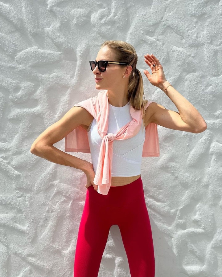 На фото Клишина изображена стоящей у белой стены. На легкоатлетке белый топ и красные легинсы, на плечи накинут легкий розовый свитер.