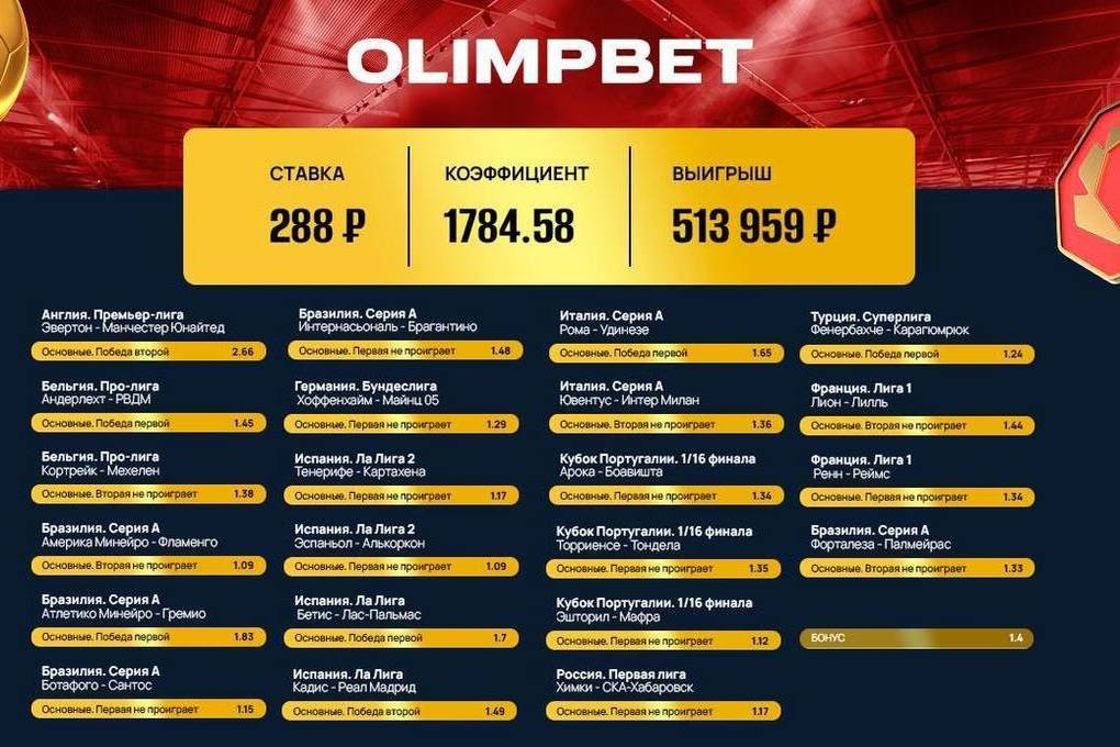 Клиент Olimpbet совершил путешествие по элитным национальным чемпионатам и кубковым турнирам нескольких стран — от Бразилии через Португалию, Англию, Бельгию, Германию, Испанию, Францию, Италию до Турции и России.