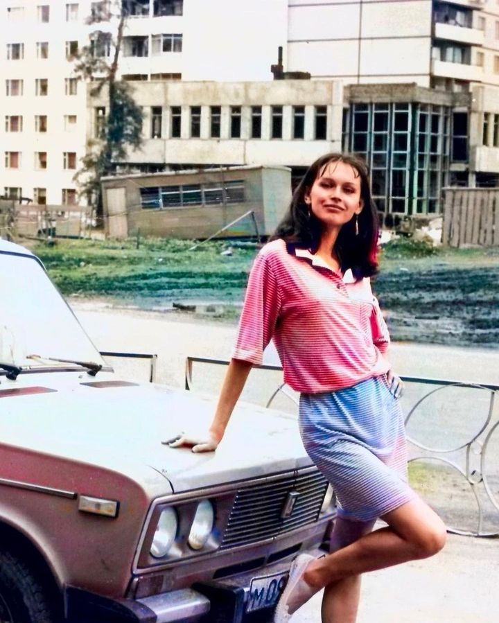 Бывшая жена Сергея Безрукова поделилась двумя снимками. На одном она стоит в полный рост, опершись на автомобиль советского производства. На Ирине мини-платье в полоску и балетки. Второе фото сделано с близкого ракурса.