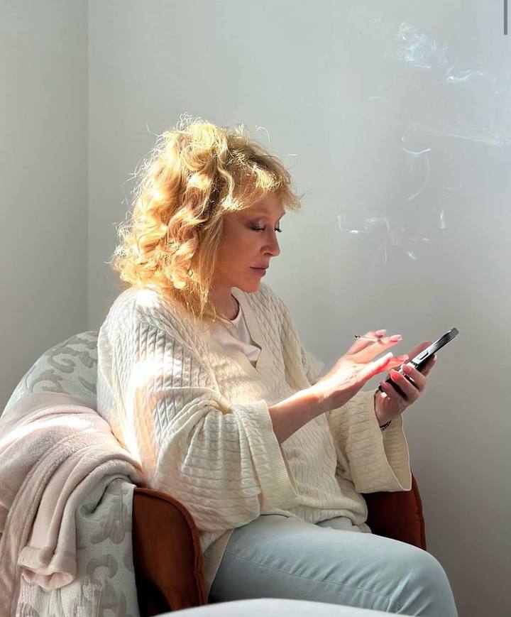 Фотография сделана в домашней обстановке. Примадонна сидит в кресле, устремив взгляд в телефон. На певице голубые джинсы и просторный белый свитер. В пальцах артистки зажата сигарета, над ее головой витают клубы дыма.