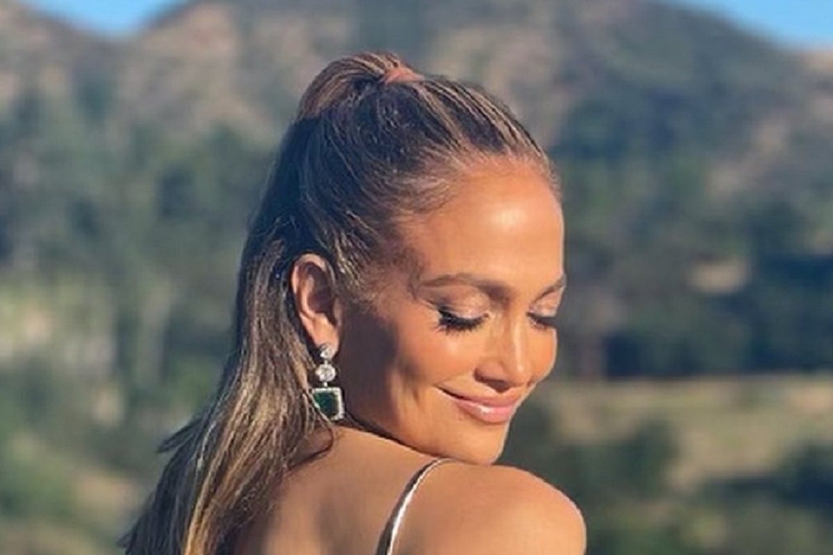 Дженнифер одета в элегантное платье из зеленого шелка. Половину лица закрывают большие слегка затемненные очки.