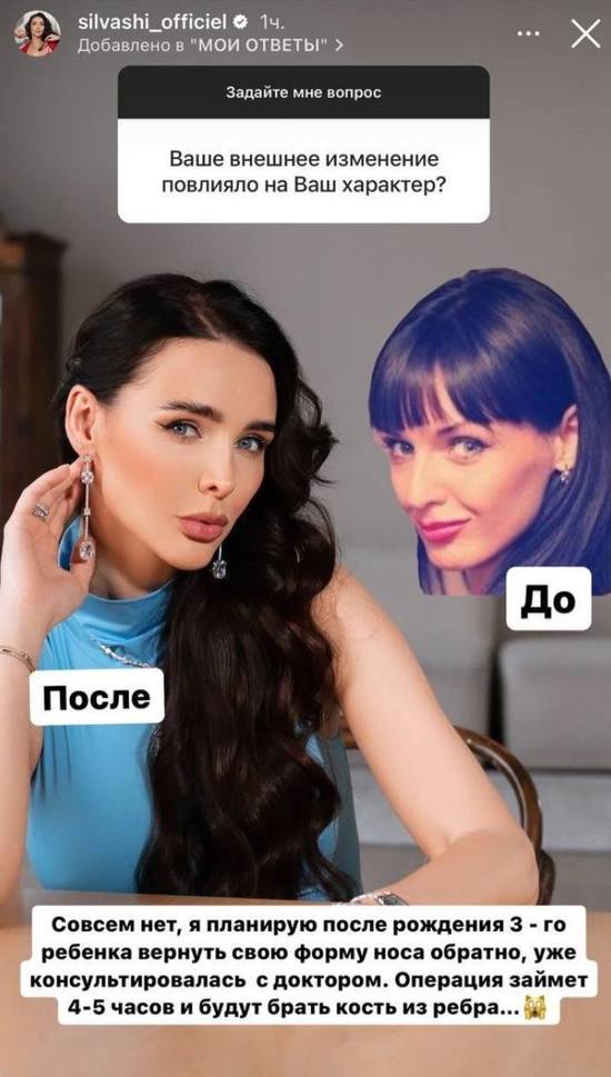 Общаясь с подписчиками, Сильваши ответила на вопросы о собственных пластических операциях. Светлана призналась, что прооперированный нос ей совсем не нравится. Жена Хайдарова для сравнения выложила в соцсети свои фото до и после ринопластики.