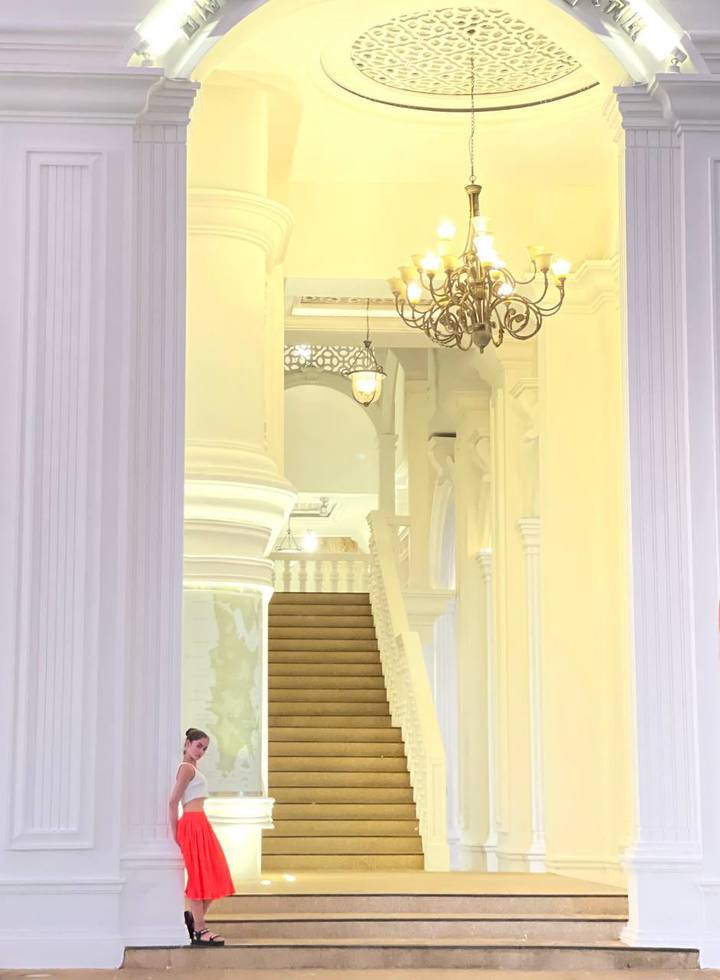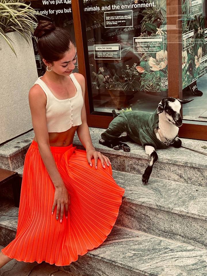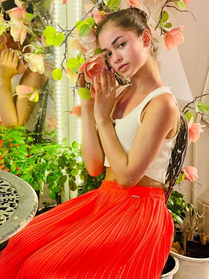 На страничке Петросян в соцсетях появились снимки, где она позирует на фоне живописных зданий и цветущих кустов. На юной красавице белый кроп-топ, открывающий взглядам рельефный пресс, и красная плиссированная юбка. Волосы Аделия собрала в высокий пучок, в уши вдела серьги-кольца.