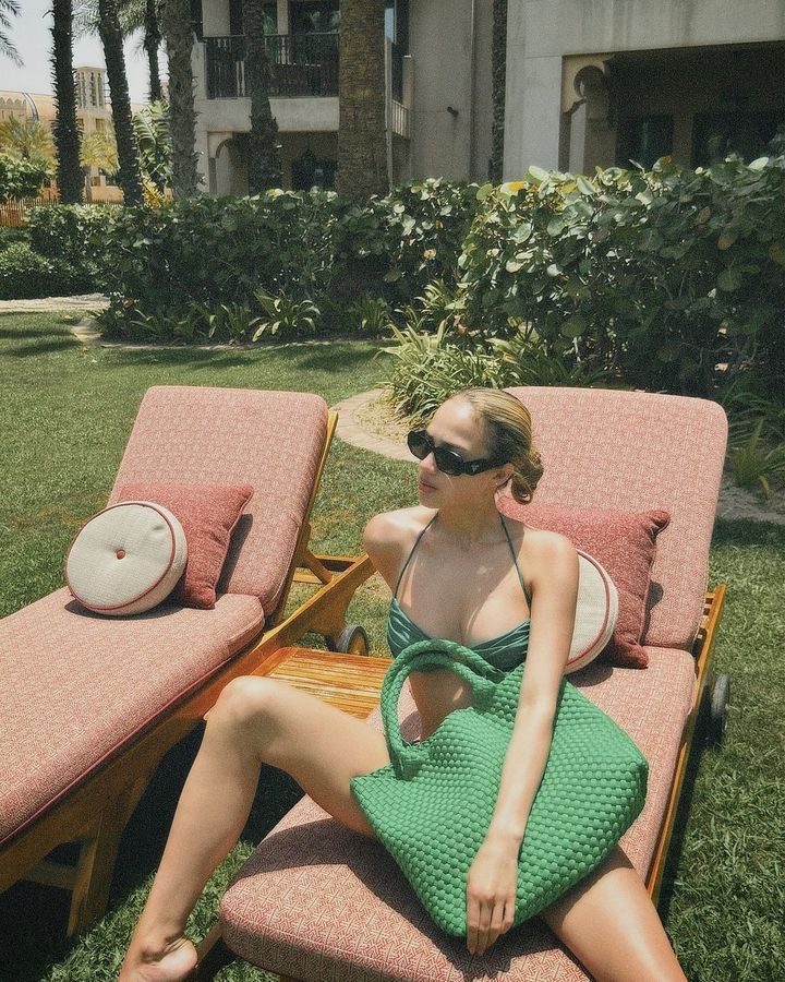 Красавица-спортсменка сменила два микрокупальника. В одном она отдыхала на шезлонге, в другом купалась в бассейне.