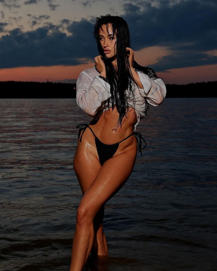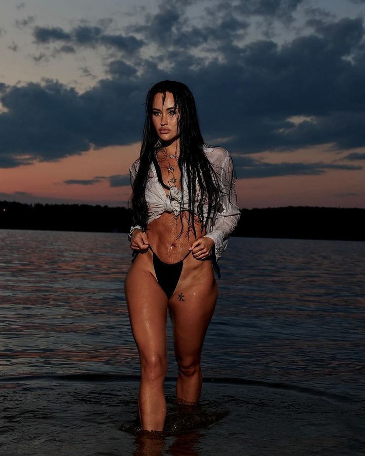 На новых снимках отчетливо виден железный пресс, сильные ноги и округлые бедра чемпионки. Татарева снялась в плавках-стрингах, бюстгальтером она пренебрегла, завязав под грудью промокшую насквозь белую рубашку.