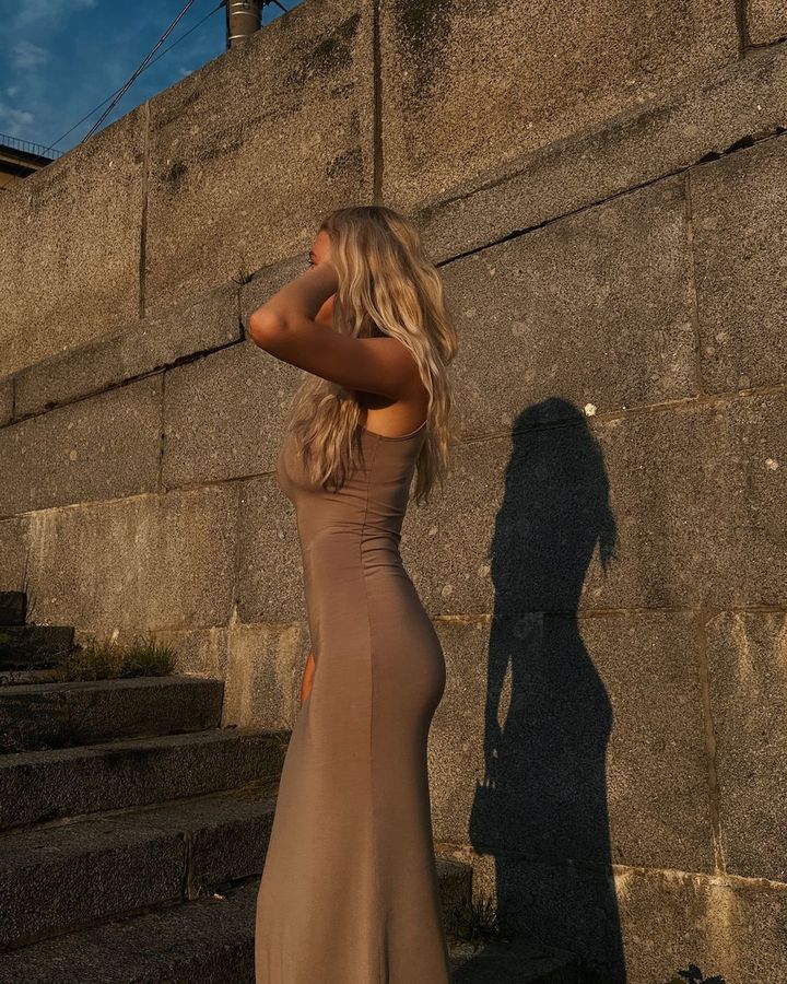 Гуляя по Питеру, фигуристка сфотографировалась и поделилась снимками с подписчиками. Для прогулки Софья оделась в трикотажное облегающее платье-миди кофейного цвета, дополнив его кроссовками.