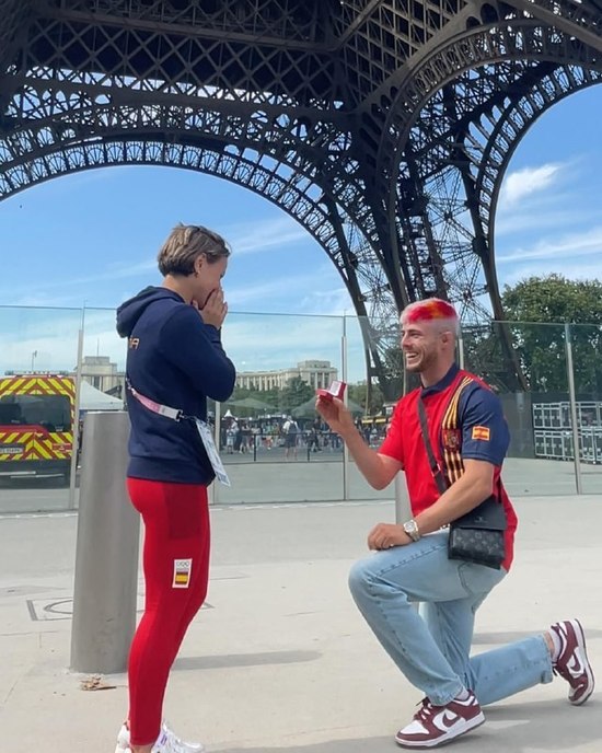 Девушка получила предложение руки и сердца от возлюбленного хоть и не на виду тысяч болельщиков, зато на фоне Эйфелевой башни. Двукратный чемпион Испании по дзюдо опустился на одно колено и протянул спортсменке кольцо. Девушка ответила согласием.