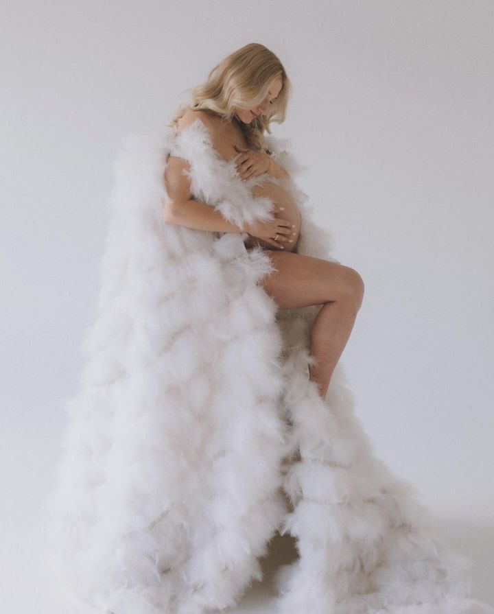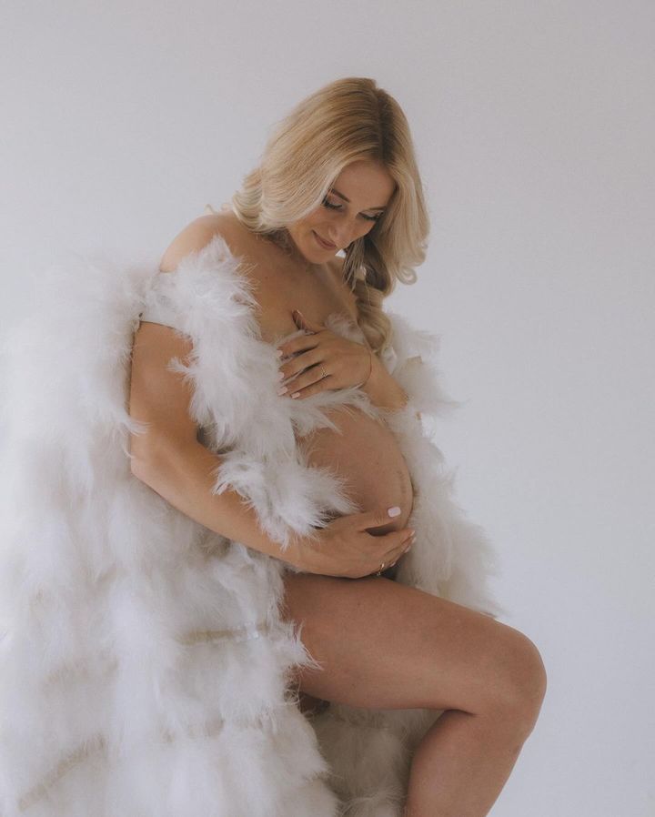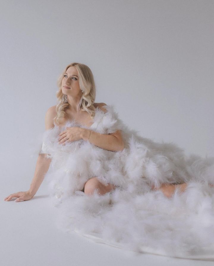 На страничке Ахаимовой в соцсетях появилась серия фотографий, где она позирует в накидке из белых перьев, надетой на голое тело. Одежда прикрывает лишь самые интимные части тела беременной спортсменки.