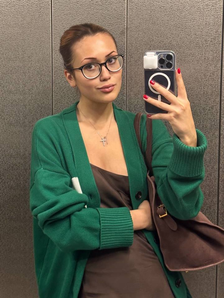 Известная веселым характером Елизавета сфотографировалась в кофейном платье и трикотажном кардигане изумрудно-зеленого цвета. Волосы Худайбердиева уложила в гладкую прическу, на лицо нанесла неяркий макияж.