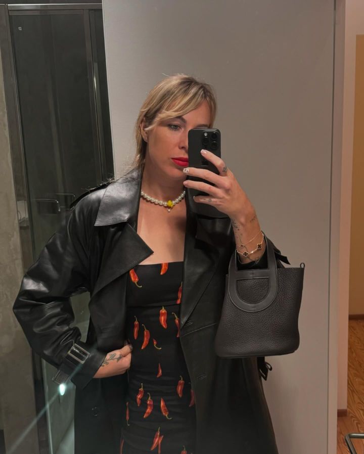Для свидания с любимым Павлюченкова принарядилась. Она надела черное платье с принтом в виде перчиков и глубоким декольте. Сверху Анастасия накинула черный кожаный тренч и накрасила губы ярко-красной помадой.