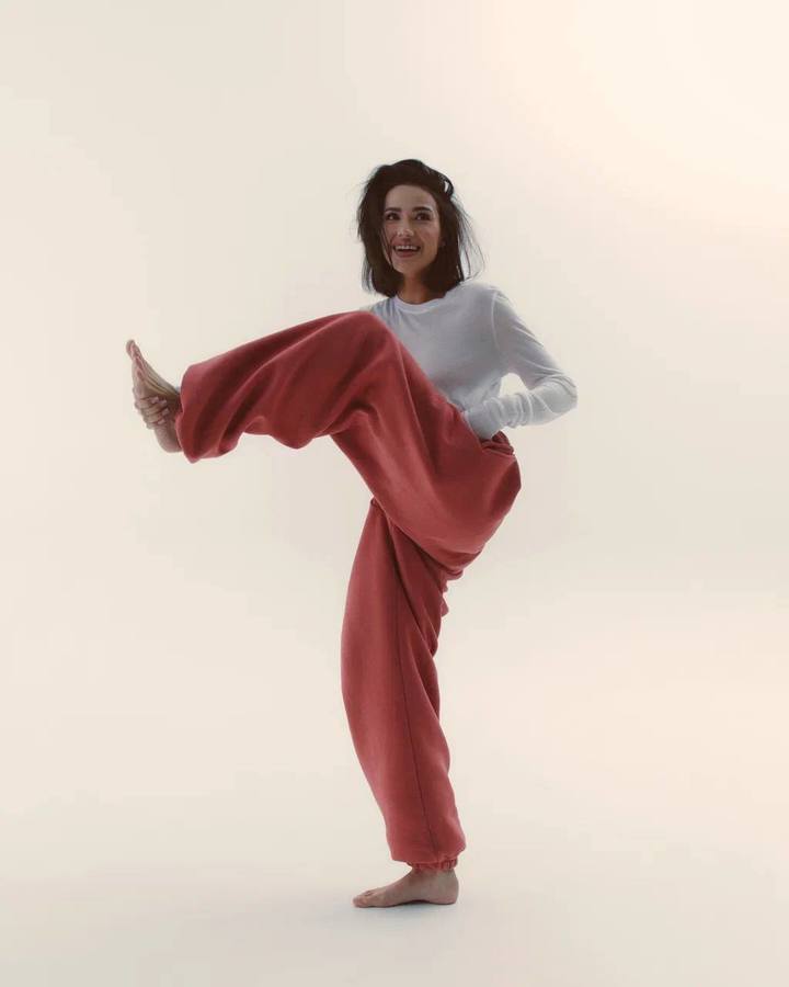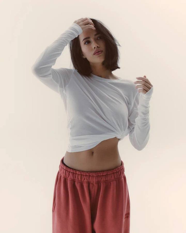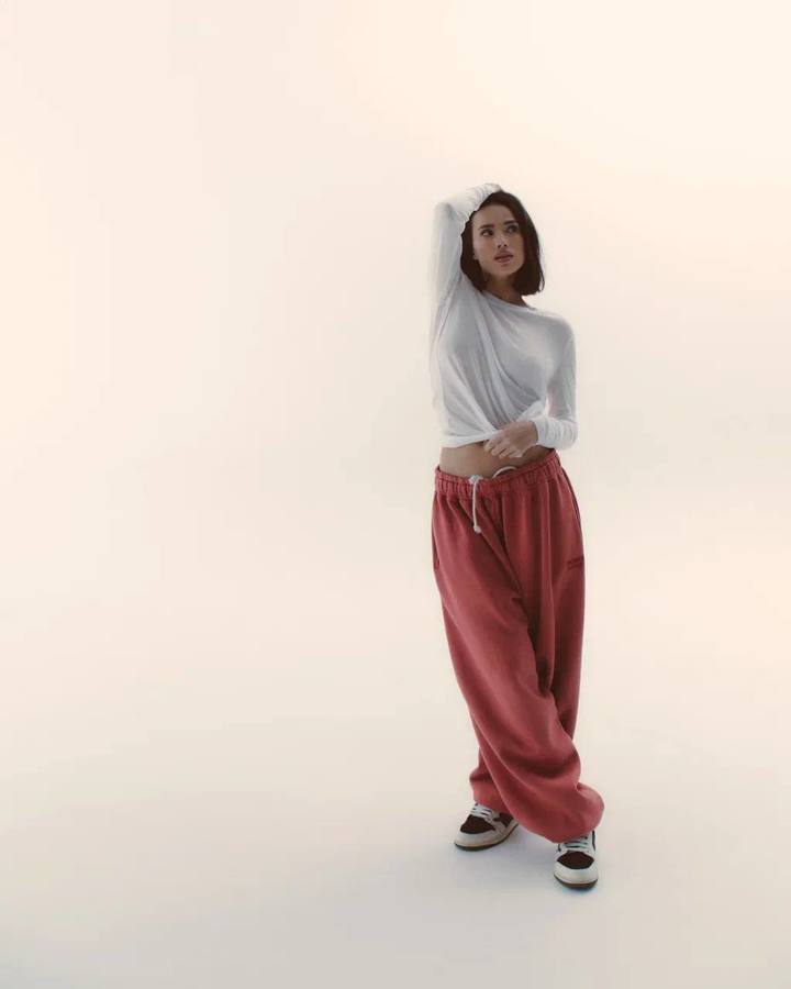 Для съемки Загитова оделась удобно и сексуально. Она выбрала широкие спортивные джоггеры кораллового цвета и полупрозрачный лонгслив из белой сетки. Бюстгальтер Алина надевать не стала.