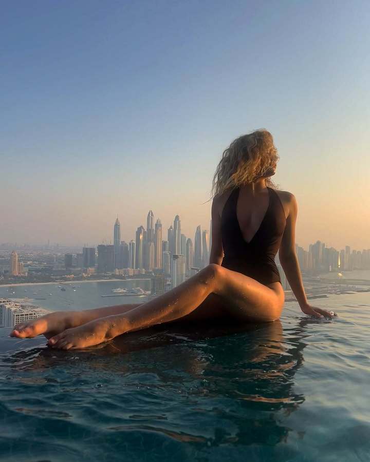 На страничке Овсянкиной в соцсетях появилась серия снимков, сделанных в отеле в Дубае. Алиса позирует на бортике бассейна с красивым панорамном видом, а также частично погрузившись в воду.