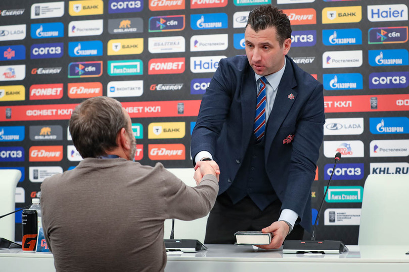 И уже по сложившейся традиции завершаем наш обзор эпизодом с участием самого медийного персонажа нашего хоккея, главного тренера СКА Романа Ротенберга. Как известно после победных матчей питерского клуба этот наставник вручает будильник на послематчевых пресс-конференциях наиболее понравившемся ему журналистам. И это также уже стало традицией. После домашнего поражения от Куньлуня (4:6) Роман Борисович, естественно, пришел на встречу с пустыми руками, а ушел... с книгой мыслей и афоризмов, которую ему вручил один из местных журналистов.