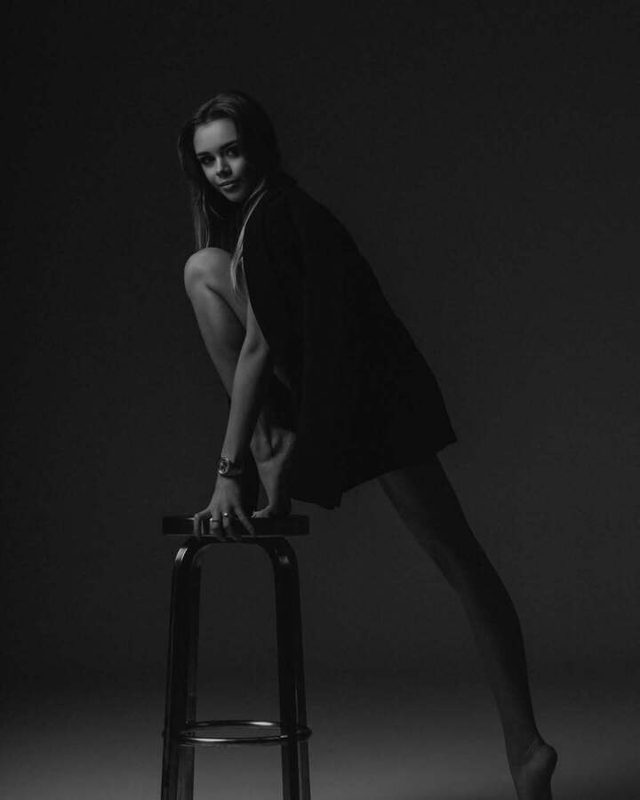 На страничке Анны в соцсетях появилось два снимка — цветной и черно-белый. На них Попова позирует, поставив одну ногу на высокий барный стул.