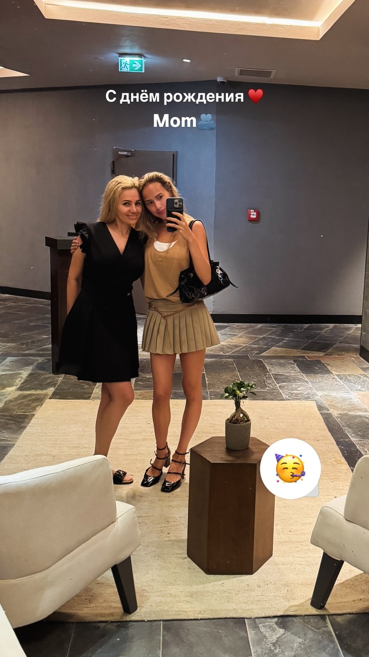 Для выхода в свет виновница торжества оделась в черное кожаное платье, а ее знаменитая дочка облачилась в белую юбку-макси и кроп-топ с рукавами. Семейство сфотографировалось в полном составе, Алина также сделала фото вдвоем с мамой.