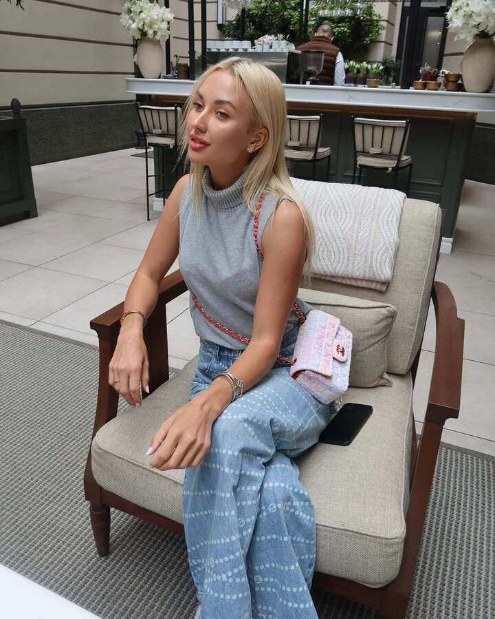 На страничке Потаповой в соцсетях появились фотографии, сделанные на отдыхе. Анастасия одета стильно и удобно: на ней серый трикотажный топ без рукавов и с высоким воротом, просторные голубые джинсы с принтом и белые кроссовки.