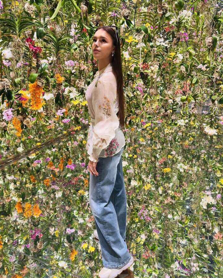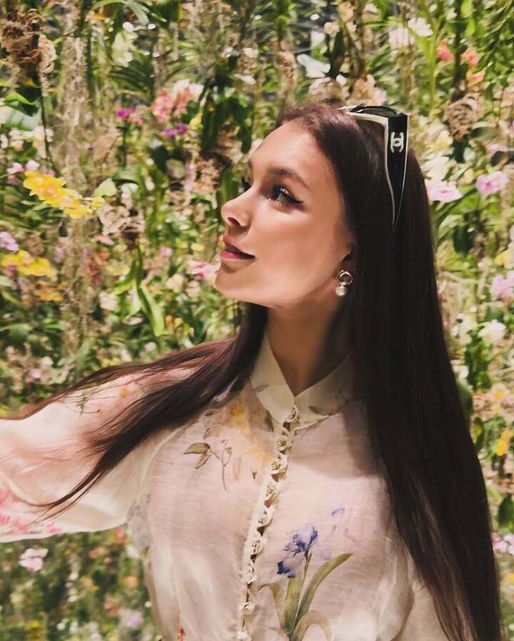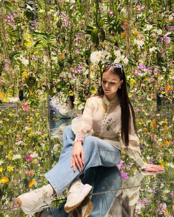 Особенно яркими получились снимки, где Анна позирует на фоне цветов. На фигуристке просторные голубые джинсы и блузка с пышными рукавами с цветочным принтом. Талию подчеркивает изящные белый ремешок.