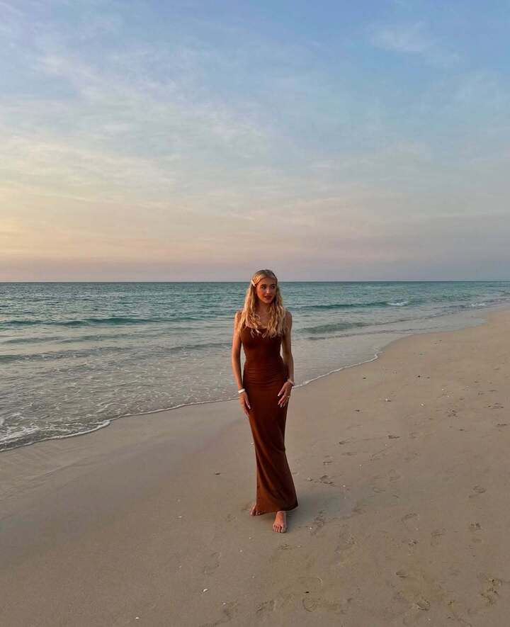 На фигуристке коричневое трикотажное макси-платье на тонких бретелях. Наряд красиво облегает идеальную фигуру белокурой спортсменки.