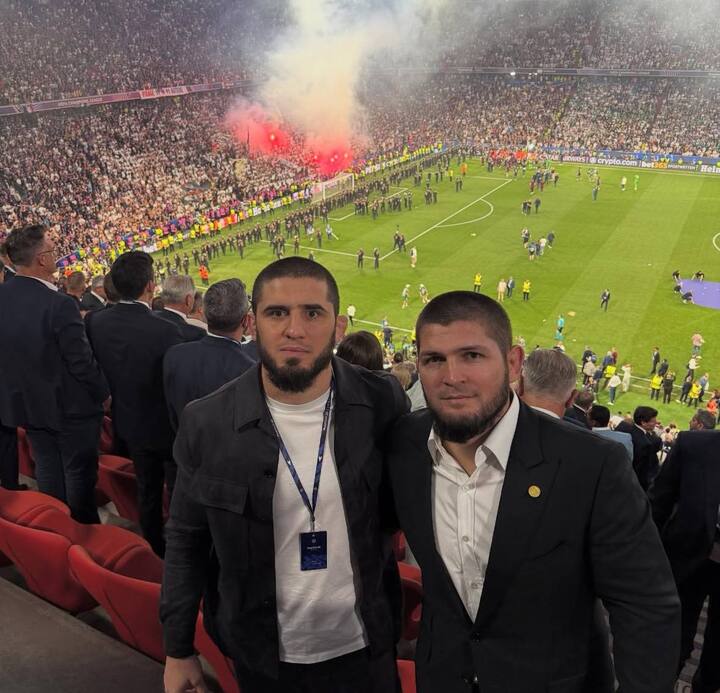 Российские бойцы смешанного стиля Хабиб Нурмагомедов и Ислам Махачев посетили финальный футбольный матч Лиги чемпионов между ПСЖ и "Интер" в Мюнхене.