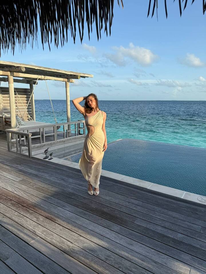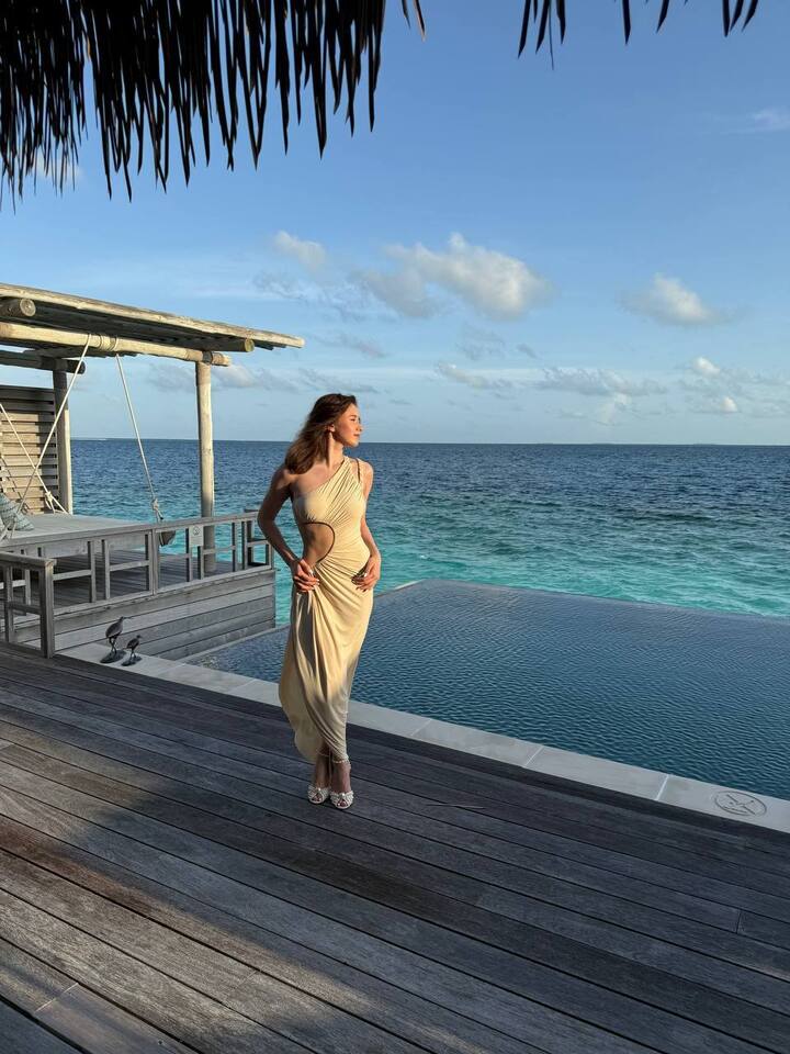 В соцсетях Валиевой появилось два снимка, сделанных у бунгало, где, по всей видимости, остановилась спортсменка. Камила позирует в макси-платье молочного цвета.
