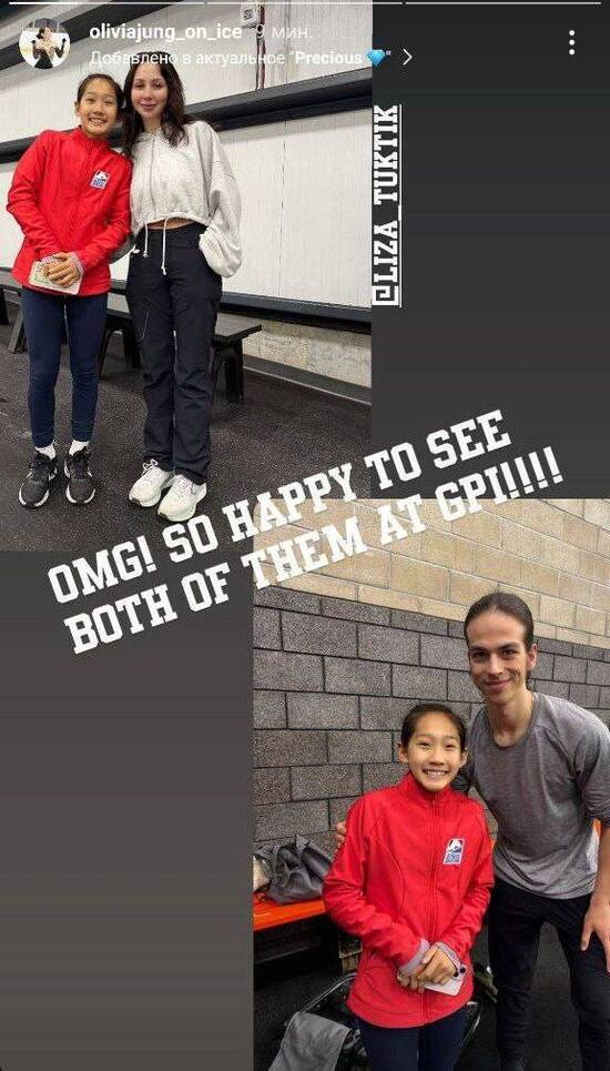 Оливия сфотографировалась поочередно с Туктамышевой и Гуменником. Снимки, сделанные в одной локации, юная фигуристка объединила в коллаж и подписала так:
