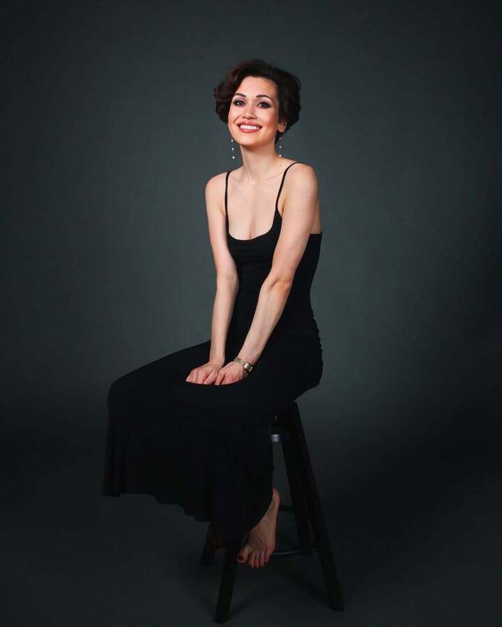 Худайбердиева предстала перед фотокамерой без обуви. Она выбрала облегающее сверху и расклешенное снизу макси-платье из черного трикотажа. Пикантной деталью наряда стали тонкие бретели и откровенное декольте.