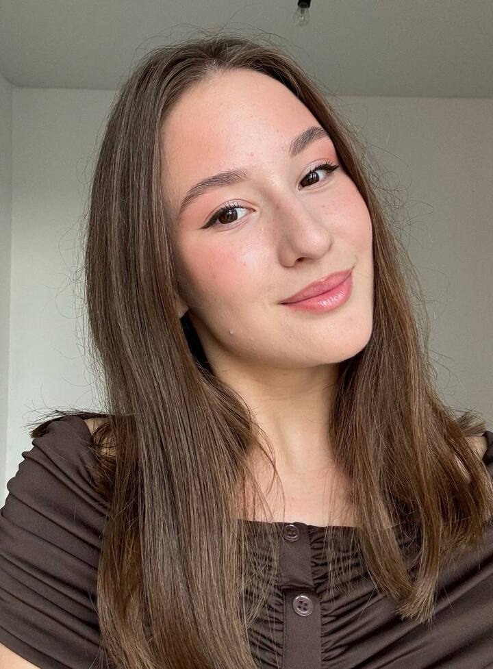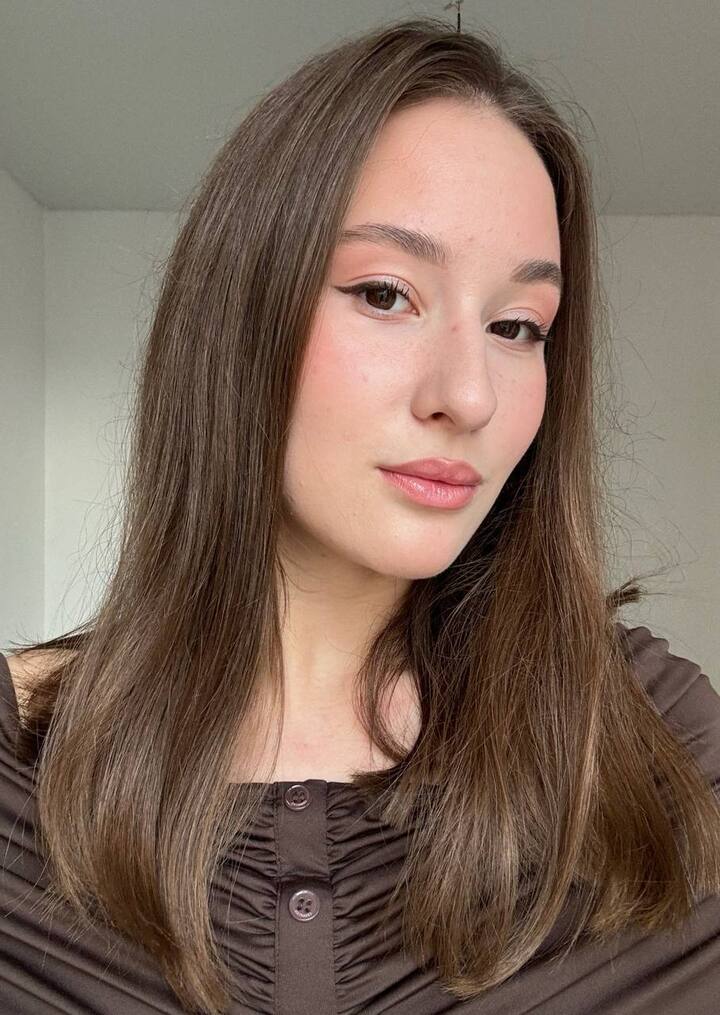 На фото Софья смотрит в объектив, кокетливо склонив голову, и нежно улыбается. На девушке коричневое платье с драпировкой и открытыми плечами. Волосы фигуристки распущены, на лице легкий макияж со стрелками на глазах.