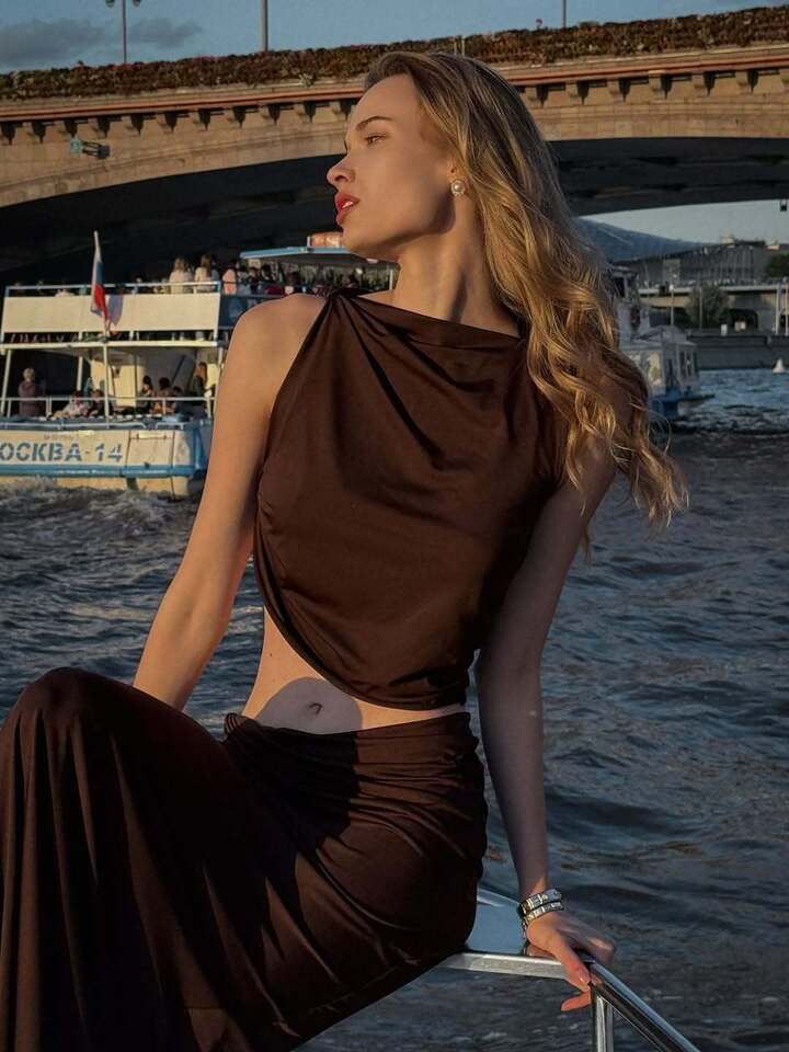 Шишмакова позировала босиком в коричневом костюме, состоящем из длинной юбки и асимметричного топа, открывающего живот. Наряд подчеркнул красивые изгибы стройного и женственного тела гимнастки.