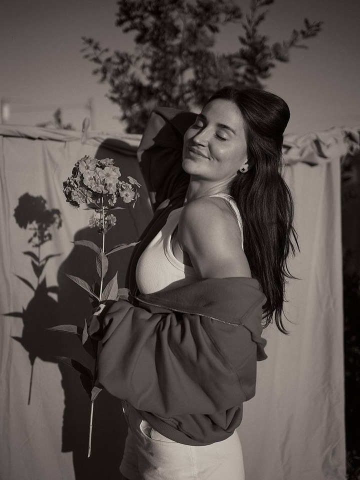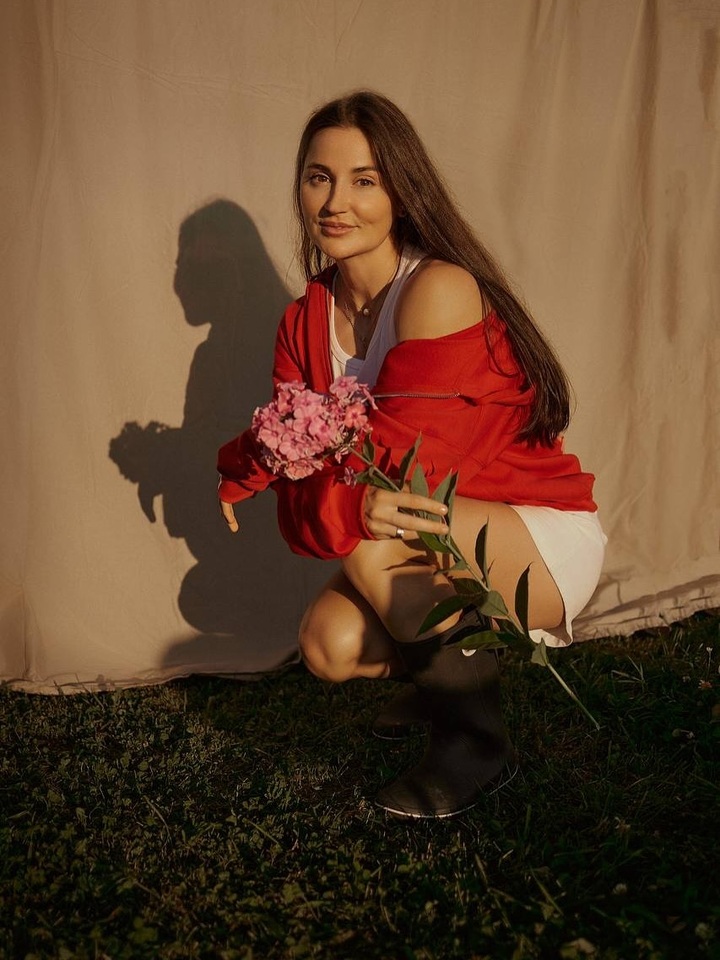 Белорукова снялась во дворе, на фоне развешенного для сушки белья. В руках у чемпионки садовый цветок. Снимки получились очень атмосферными.