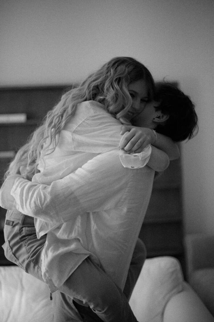 Для второго фото Александра запрыгнула на супруга, обхватив его руками и ногами. Макар прогнулся назад, но удержал жену на руках.