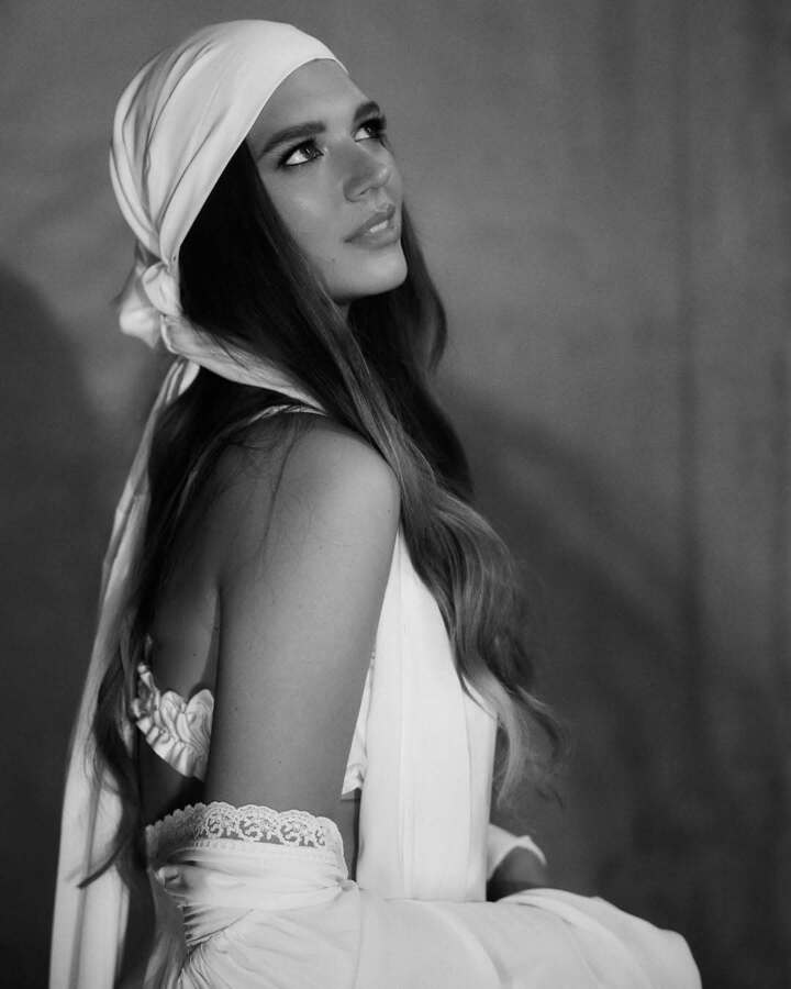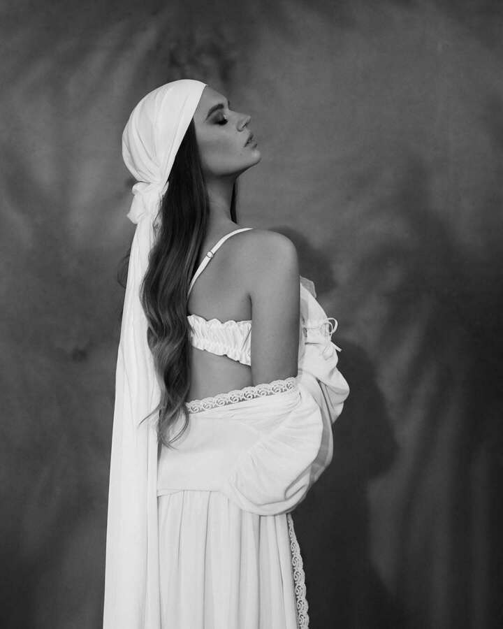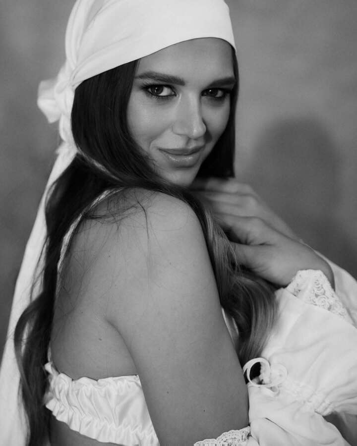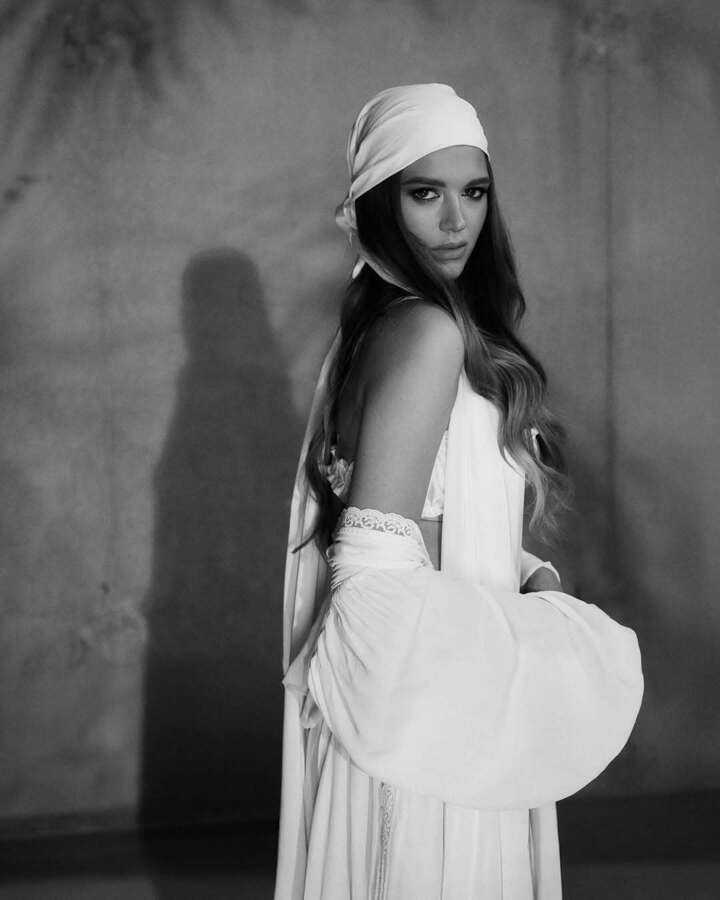 Новые черно-белые фотоснимки появились на страничке Солдатовой в соцсетях. Четырехкратная чемпионка мира предстала перед фотографом в этническом наряде, состоящем из пышной кружевной белой юбки, бюстгальтера и накидки. Голову Александра покрыла белой шалью, завязав ее как платок.