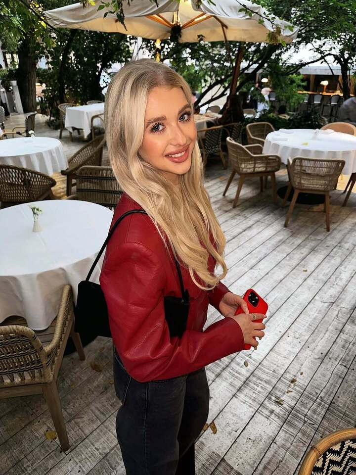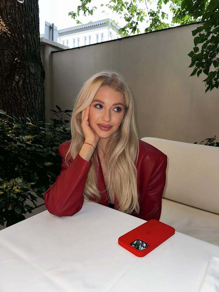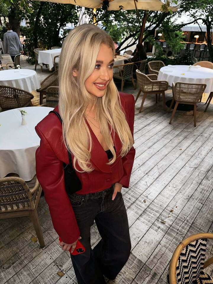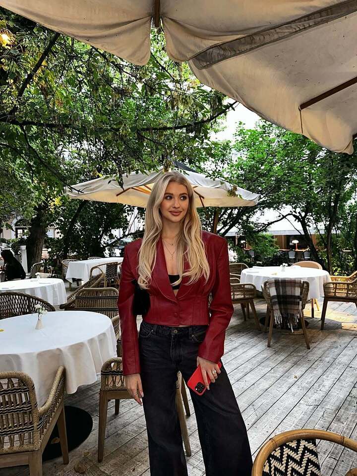 Леонтьева продемонстрировала стильный лук для начала осени. Софья снялась в уличном кафе. На ней темно-синие просторные джинсы с посадкой на бедрах и красная кожаная куртка, под которую спортсменка надела черный бюстгальтер-бра.