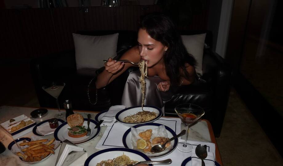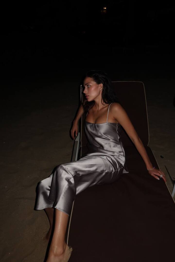 Сначала Алина облачилась в серебристое платье-комбинацию с откровенным декольте. В этом наряде фигуристку сняли на пляже, а также во время ужина. В ленту попал кадр, где Загитова наклоняется над тарелкой с пастой и открывает взглядам соблазнительную ложбинку в вырезе платья.