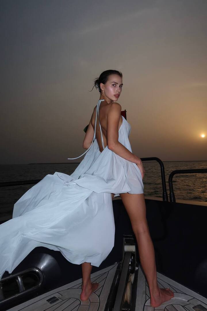 В таком виде Загитова позировала на борту катера во время морской прогулки после заката. Фигуристку сняли сидящей в изящной позе, а также стоящей во весь рост. Грудь Алина скромно прикрыла рукой.