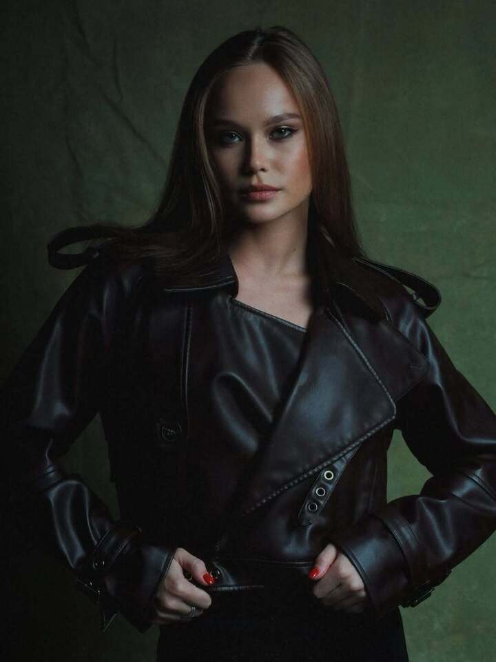 Мельникова поделилась новым фото, сделанным в студии. Ангелина позирует стоя, на фоне темно-зеленой стены. На спортсменке, снятой с близкого расстояния, черная кожаная куртка-косуха с погонами.
