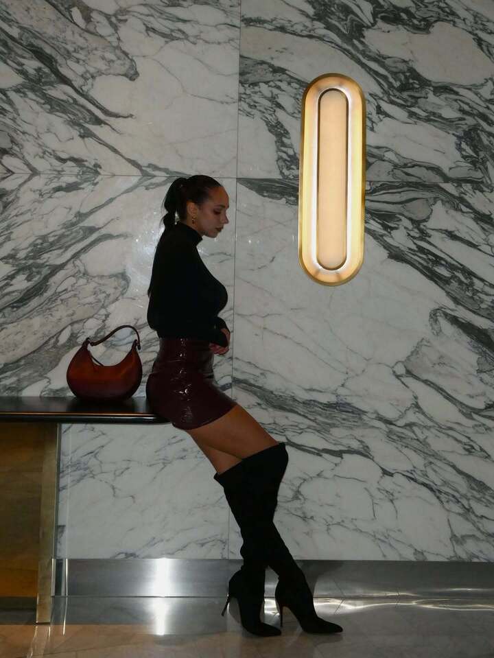 Спортсменка снялась на фоне мраморных стен, а также присев на краешек стола и вытянув ноги. На брюнетке черная водолазка и вишневая мини-юбка из лаковой кожи.